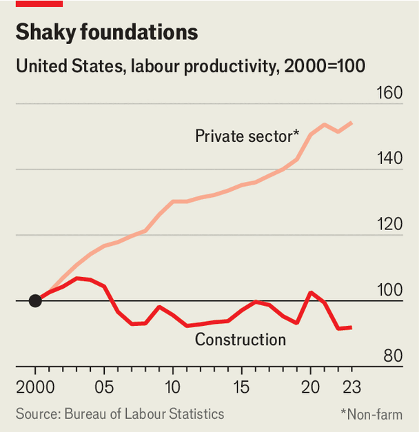 Demand for projects is certainly soaring. Turner Construction Company, America’s largest commercial builder, reported that its order backlog rose by a fifth, year on year, in the first quarter of 2025. Yet delays and cost overruns remain inevitable. Productivity has gone from bad to worse. Since 2000, output per worker in the construction industry has fallen by 8%, even as it has risen by 54% for the private sector as a whole (see chart). The trouble is not limited to commercial projects. America’s house-building companies construct the same number of dwellings per employee as they did nine decades ago, contributing to widespread shortages and soaring prices. Behind this dismal state of affairs is a combination of fragmentation, overregulation and underinvestment.