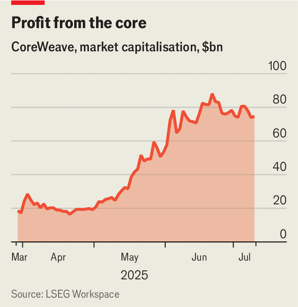 EVEN BY THE mind-boggling standards of the artificial-intelligence (AI) boom, the growth of CoreWeave is striking. Two years ago the so-called neocloud, which rents out access to AI computing power, was a scrappy startup generating about $200m a year in revenue with a small fleet of data centres. Today things look rather different. Analysts expect it to make over $5bn in sales this year. As of January it operated 28 data centres, with ten more being added this year. Since it listed in March, its market value has rocketed by over 300%, to around $75bn (see chart).