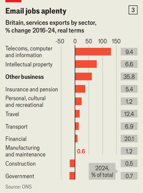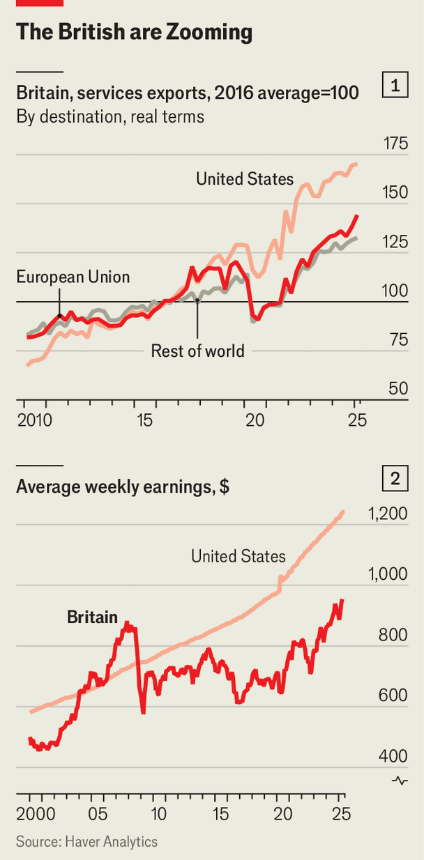 Britain’s success in providing professional services on the cheap has so far mostly gone unnoticed. One exception is the film business, where Britain’s cheap and high-quality labour (plus a sprinkling of subsidies) have lured big-budget productions such as the latest entries in the “Mission: Impossible” franchise. Hollywood’s complaints to Donald Trump prompted a brief flirtation with movie tariffs, though the president now seems to have dropped the idea.